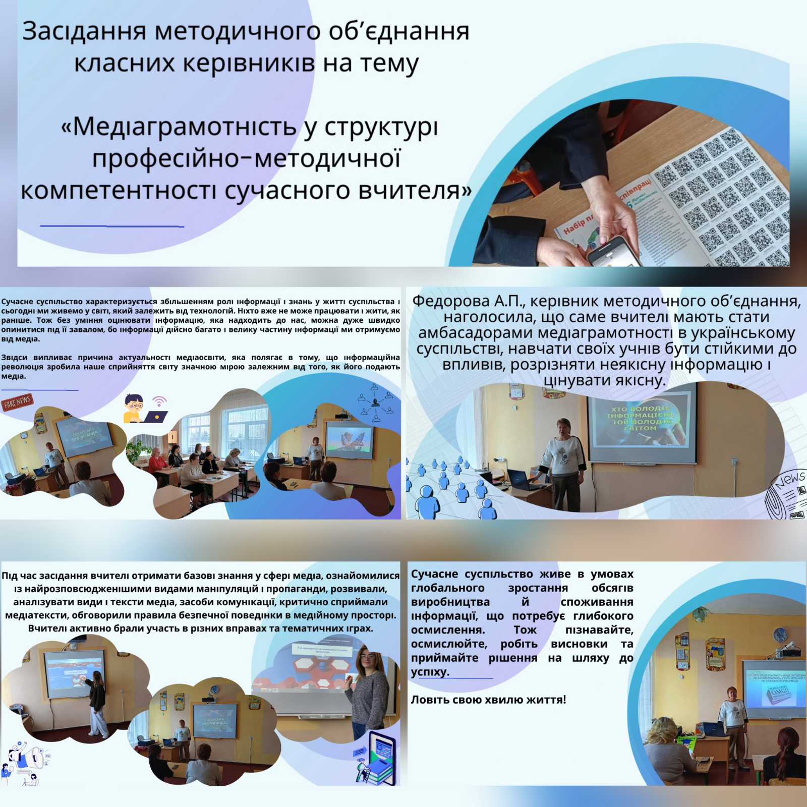 Федорова А.П., керівник методичного об’єднання, наголосила, що саме вчителі мають стати амбасадорами медіаграмотності в українському суспільстві, навчати своїх учнів бути стійкими до впливів, розрізняти неякісну інформацію і цінувати якісну.
